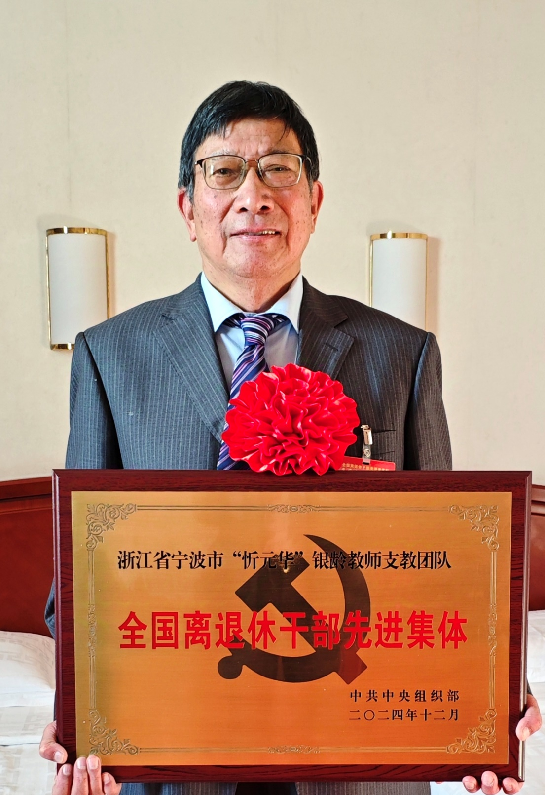 在2024年12月30日举行的全国离退休干部先进集体和先进个人表彰大会上,“忻元华”银龄教师支教团队获“全国离退休干部先进集体”荣誉称号。忻元华作为浙江省先进集体代表,赴京参会。